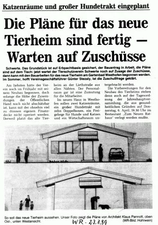 Doch im Februar 1989 stand endlich fest: Wir können ein neues Tierheim bauen! Die finanzielle Decke war zwar mehr als dünn, aber ein geeignetes Grundstück konnte von der Gräflichen Stosch’schen Rentei gepachtet werden.